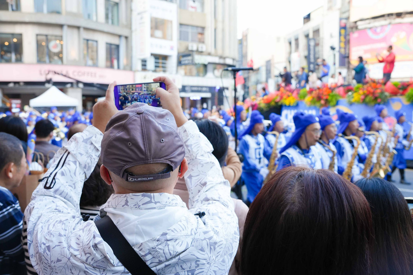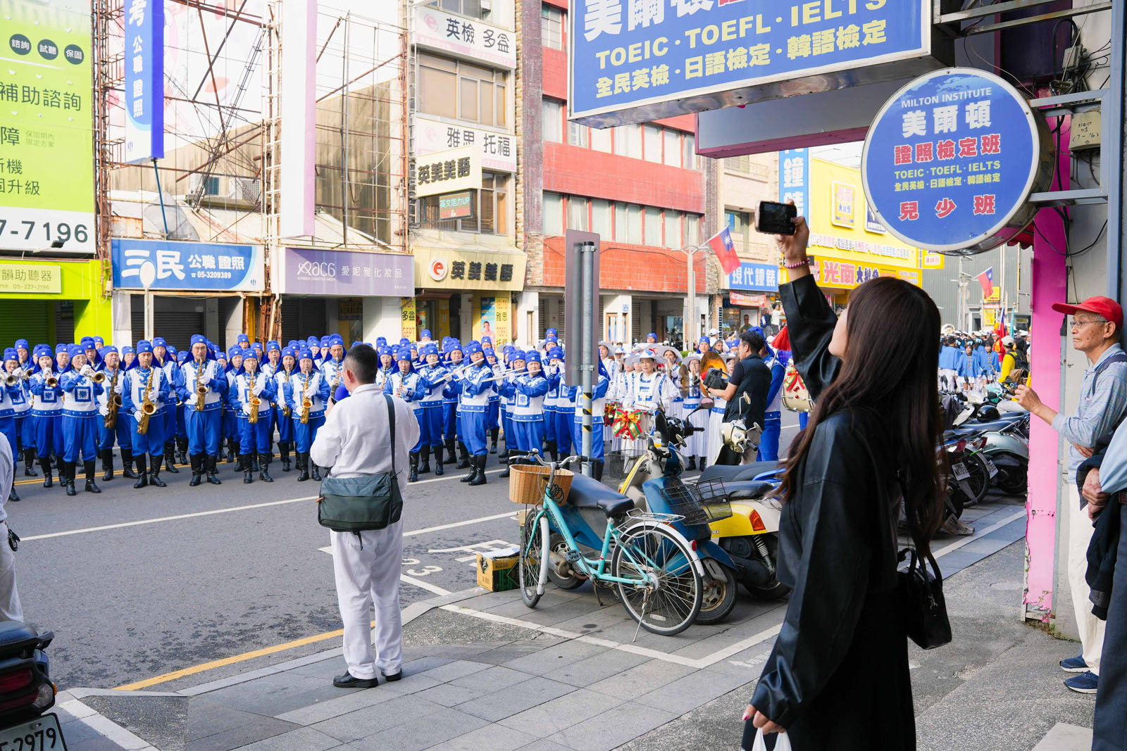 法輪大法天國樂團氣勢磅礡,樂音嘹亮震撼人心,遊行期間家家戶戶的人都從巷弄裏出來慶祝、歡迎。觀眾們紛紛拿起相機紀錄,熱情的向團員揮手、比出「讚」的手勢。